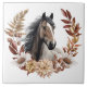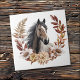 A beautiful portrait of a mouse brown grulla horse with a white blaze is placed at the centre of a pretty autumn wreath in tones of cinnamon brown, tan, and cream. The horse and wreath design is placed on a white background.