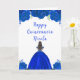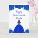 This Quinceanera birthday card features faux glitter royal blue floral flowers and a beautiful princess with brown hair and an elegant dress. This is perfect for a Quinceanera birthday party.
