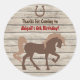 Personalised brown silhouette horse with horseshoes on a barn wood background birthday party thank you stickers. This design is perfect for both girls and boys.