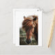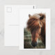 This postcard features a close-up portrait photo of a brown horse in a field.