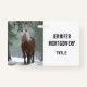 Name badge with a photograph of a brown horse with a long white scruffy mane. Standing in a forest with snowflakes falling all around.