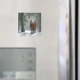 A magnet with a photograph of a brown horse with a long white scruffy mane. Standing in a forest with snowflakes falling all around.