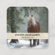 A business card with a photograph of a brown horse with a long white scruffy mane. Standing in a forest with snowflakes falling all around.