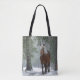 Tote bag with a photograph of a brown horse with a long white scruffy mane. Standing in a forest with snowflakes falling all around.
