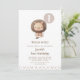 Cute lion themed first birthday invitation featuring a lion illustration in natural tones, a balloon and dash pattern border at the lower part of the invitation design. This boy's lion wild one first birthday invitation is ideal for someone looking for a modern wild one invitation design.