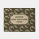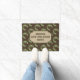This is a cute door mat which is perfect for a cabin or woodland home. It features a background of a brown moose head silhouette within a green circle frame repeated throughout the pattern. There is a matching label at the centre with your custom text. Currently it says "MOOSE ARE WELCOME HERE" but you may easily customise it to your own text