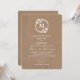 A monogram wedding invitation featuring an illustration of a white floral wreath at top. Personalise with your initial inside circle. Personalise the text with details of your occasion. Wording is from bride and groom together with their families. Background is brown paper inspired.