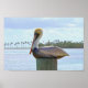 A brown pelican rests on a post on a pier in the Florida Keys. In the background, an American flag and a line of palm trees wave in the tropical breeze.