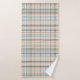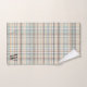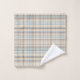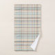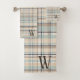 A lovely plaid bath sat, your monogram initial is at the bottom right hand corner. This wash cloth, hand towel and bath towel set has a brown and blue plaid design. Purchase yours today!