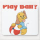An eager looking brown puppy dog with a beach ball and text that reads "Play Ball?" is featured on this dog T-shirt, tote bag, mug, stickers, magnets, and more.