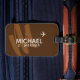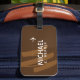 A cool and modern luggage tag personalised with the name and initial of the traveller on a brown background