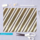 Holiday tissue paper with a diagonal stripe design of gold, white, and brown.