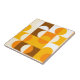 This design features a stunning contemporary pattern of geometric circles and squares in dark yellow, light orange, and white, set against a dark brown background. It exudes an ornate, elegant, and stylish vibe, making it perfect for the fancy artistic fashionista, artsy fashion diva, popular hip trendsetter, vintage retro art style enthusiast, and lover of abstract digital geometric motifs.