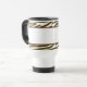 A mug featuring a full wrap border of brown zebra print across top and bottom. Pink trim. Circle at centre outlined in brown with brown monogram inside. Stencil font. Mug available in other colours and styles including ringer, morphing, and more.