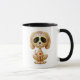 This adorable brown puppy design is decorated with swirls and dot patterns. Yellow flower pedals circle the pure black eyes in the tradition of the Day of the Dead sugar skulls. The little dog is sitting down, looking forward with its tail waving in the background. The oversized head sits on a tiny body which creates a playful, cartoon like appearance. A five point star sits in the middle of the puppy’s forehead while a bright red and yellow heart appears in the centre of the chest. This cute little puppy is a fun and stylish design inspired by the beautiful patterns of Day of the Dead sugar skulls.