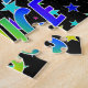 This fun, exciting, birthday-themed jigsaw puzzle design features the message "HAPPY BIRTHDAY, BRUCE" with the characters having a colourful rainbow spectrum inspired gradient pattern, in addition to a vibrant field of stars background pattern. A colourful puzzle like this might be used to send a birthday greeting message to somebody named Bruce. [~Z0000468]