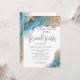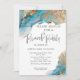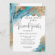Brunch and Bubbly bridal shower invitation featuring elegant alcohol ink art and watercolour painting design in shades of teal , turquoise blue and bronze with faux gold texture, accented with handwritten style calligraphy. Use our easy to customise template to personalise with your details - a bottle of bubbly with cork popping on back Stunning Design © by WhimsicalArtwork™