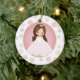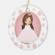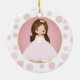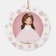 This design features a cute brown haired Princess with pink gown, crown and gloves on a super cute pink dot background.