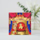 Royal Prince Baby Shower, Boy Red Crown Blue and Gold, Yellow Toy Teddy Bear and Red Chair Throne. Cute Brunette Baby Boy. Elegant Baby Shower, Couples Baby Shower boy and Red and blue Curtains Drapes Tassels invitation. new baby boy. Vintage Baby Shower.