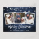 Rustic Blue Wood Brush Script 3 Photo Family Merry Christmas Card with String Lights
