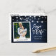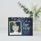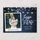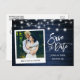 Modern Brush Script, Instant Camera Style, Couple Photo Save The Date Photo Engagement Announcement Postcard - Rustic Country Blue Wood, String Lights