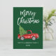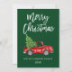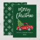 Brush Script Watercolor Vintage Red Truck with Christmas Tree - Merry Christmas Card - Green Snowflakes Back