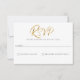 Elegant and modern brushed golden script letters, wedding RSVP cards. Back of card, shown in solid navy blue colour, features two template text lines for names and date.
