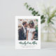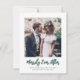 Send joyful holiday wishes as a new Mr. & Mrs! Celebrate your first married Christmas and share two of your favourite wedding pictures with a stylish custom photo "Merrily Ever After" holiday card. All text on this template is simple to personalise to include any wording, such as Merry and Married, Merrily Married, Happy Holidays, Seasons Greetings, New Year Cheers etc. Delete picture on back for space to write your own note if you need a wedding thank you and Christmas card combined. (IMAGE PLACEMENT TIP: An easy way to centre a picture exactly how you want is to crop it before uploading to the Zazzle website.) The modern minimalist black, white and green design features trendy handwritten style script typography and 2 photos of your choice. Family and friends will love displaying this elegant customised card. Cheers to the newlyweds!
