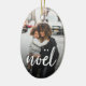 Chic Christmas ornament features a favourite photo on each side, with "noel" as a white text overlay in trendy brush script lettering. Personalise the back with your custom caption (shown with names) and the year.