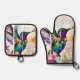 A brushstroke-style design featuring a vibrant hummingbird adorned with a spotted bow tie, its wings fluttering as it hovers gracefully above a nest fille