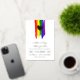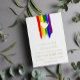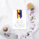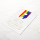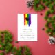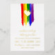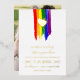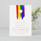 Charming lgbt wedding invitation with rainbow pride flag drawn with messy strokes and adorned with a golden heart against a white background with gold foil text.