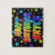 This lively, fun, birthday-themed jigsaw puzzle design has the message "HAPPY BIRTHDAY, BRYCE" with the characters having a colourful rainbow spectrum inspired gradient pattern, in addition to a vibrant star shapes background pattern. A vibrant puzzle like this might be used to send birthday wishes to somebody named Bryce. [~Z0000468]