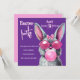 Cute grey Easter Bunny wearing a cute pink bow between her ears and wearing stylish pink sunglasses with a bubble gum bubble. Placed on a background of purple on this fully customisable Easter Party invitation. Add your party details for friends, neighbours and all of your guests. The reverse of the party invitation is a delicate pink.