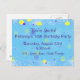 Colorful purple and yellow dots on a textured blue background make a great birthday invitation design.