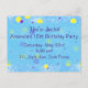 Colourful purple and yellow dots on a textured blue background make a great birthday invitation design.