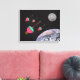 A holiday space fantasy with bubble light space ships orbiting the Earth with the moon in the distance and a starry sky background. A science fiction art illusion.