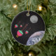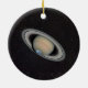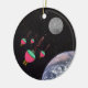 A holiday space fantasy with bubble light space ships orbiting the Earth with the moon in the distance and a starry sky background. A science fiction art illusion. The other side shows the planet Saturn in deep space against a starry sky.