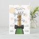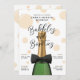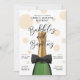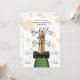 Modern and fun party invitation featuring a champagne bottle with a bow tie and floating champagne bubbles.