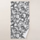 This towel set has a black washcloth, a white hand towel, and a bath towel with a mid-century modern design of concentric circles scattered about the whole design.