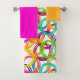 This towel set has a gold washcloth, a bright pink/purple hand towel and a bath towel with a geometric design of three circles nested together and spread throughout the design in several colours.