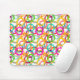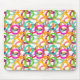 This mouse pad has a geometric design of three circles nested together and spread throughout the design in several colours.