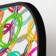 This pickleball paddle has a geometric design of three circles nested together and spread throughout the design in several colours.