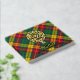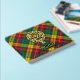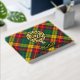 Clan Buchanan crest badge surrounded by a strap and buckle over tartan background. Custom front, back and spine text.