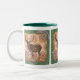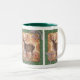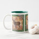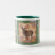 Here's a holiday mug with a masculine flare. A silhouette of a buck deer blends into a tan, snowflake like pattern, both centred on a green background. Silvery accents adorn the corners, giving a wind blown effect to the entire picture. Sure to please.