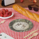 Baby gender reveal party plates featuring an illustration of two baby deer. Doe is wearing a flower crown. Text says "Buck or Doe? Soon We'll Know!" Background is camo pattern.