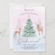 A winter baby gender reveal party invitation. The Christmas holiday themed design features a buck and doe deer in a watercolor winter snow scene surrounded by Christmas trees decorated with blue and pink baubles.