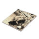 Cowboys in hats and rain coats watch a contestant coming out of the gate riding a bucking bull at a rodeo on a rainy day. Sepia print.