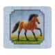 Wild buckskin horse galloping across a grassy plain. Accented with a pretty sky blue patterned background.