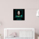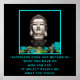 A shining silver Buddha head statue reflecting on black water filled with floating turquoise lotus flowers and green lily pads. Surrounded by a blue turquoise border and a black background. Inspirational quote below the image reads "Happiness does not depend on what you have or who you are. It solely relies on what you think."