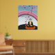 Buddha sits upon an orange lotus flower as purple and pink hearts flow from his open hand! Pink and purple rainbow and blue sky background! Wonderful and peaceful Buddhism poster! The Buddha overflows with love and compassion!